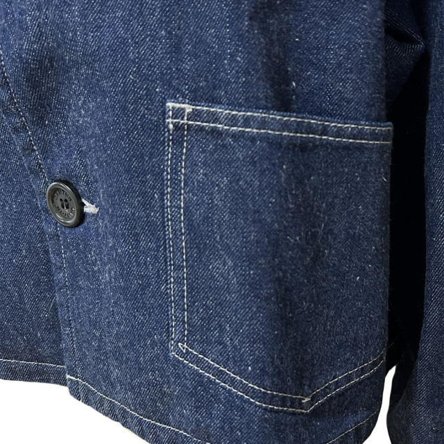ノーカラーのショート丈ジャケット。ワイドなシルエットですが、着丈を短くすることで、メリハリを出し、ボトムとバランスのとりやすいシルエットにしています。フロントには水牛ボタンを使用しており、カジュアルになりすぎないバランスに仕上げています。 スラブ糸を用いたヴィンテージ感のあるムラデニムです。 ゆるく織り上げる事でナチュラルな風合いに仕上げ、体に馴染みの良い柔らかさが特徴です。