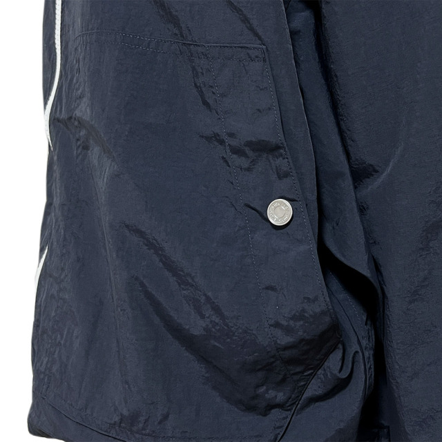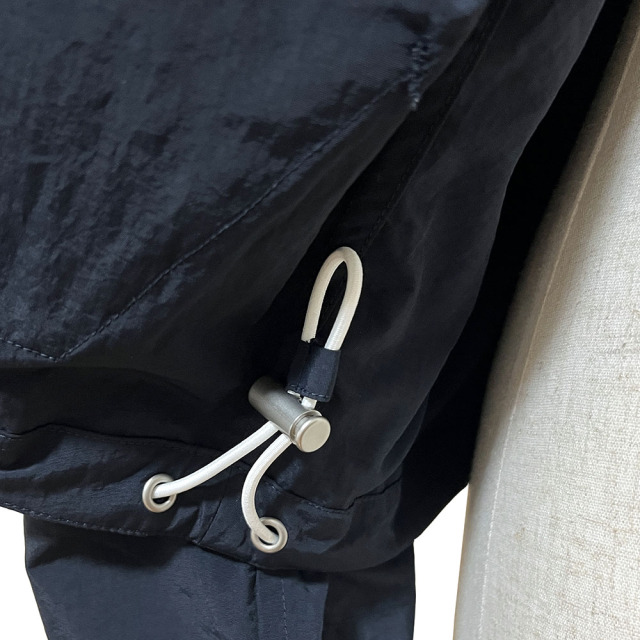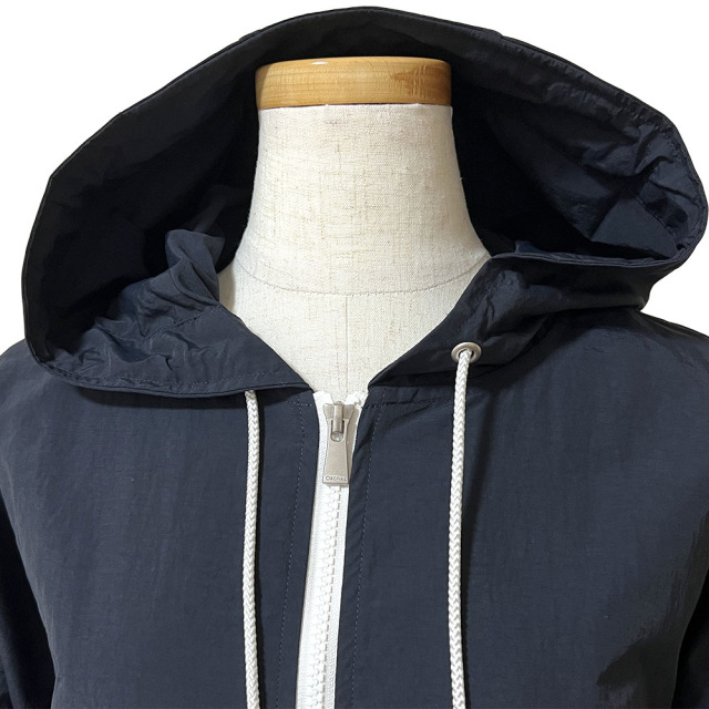 ナイロンタフタ素材でビスロンの白ジップが特徴のマリンブルゾン。 大振りなポケットが特徴となります。 リサイクル原糸で織られた綿タッチのナイロンタッサーとなります。 仕上げも環境に優しい非フッ素撥水を付与してます。 ナイロン100%でありながら、ナチュラルな表情と軽さが特徴の生地です。