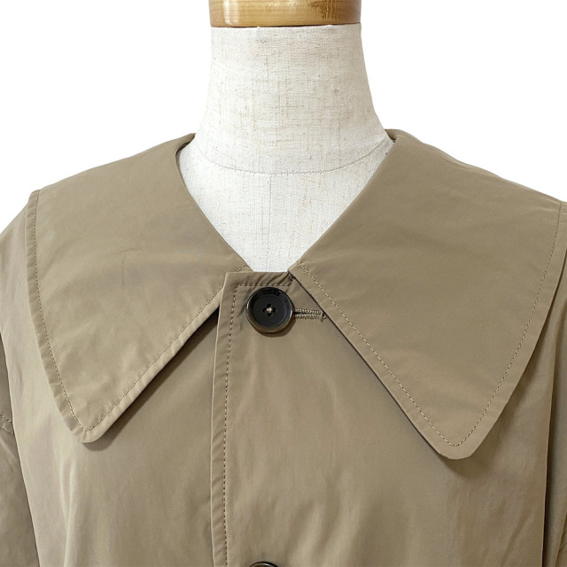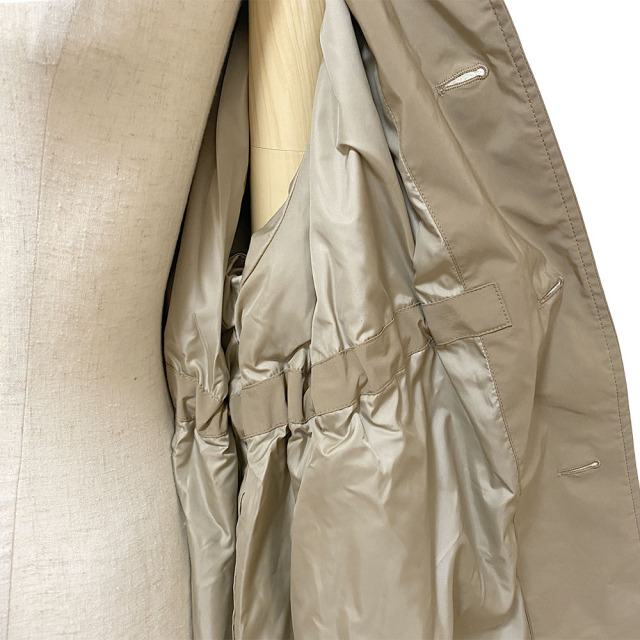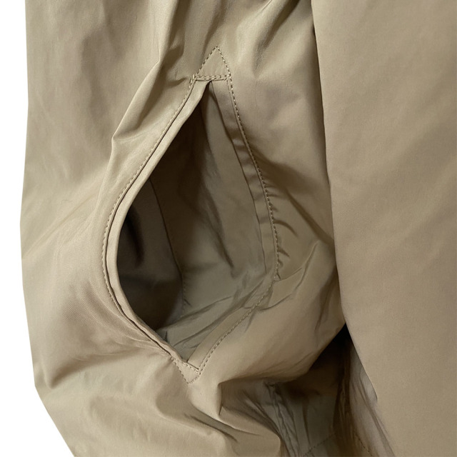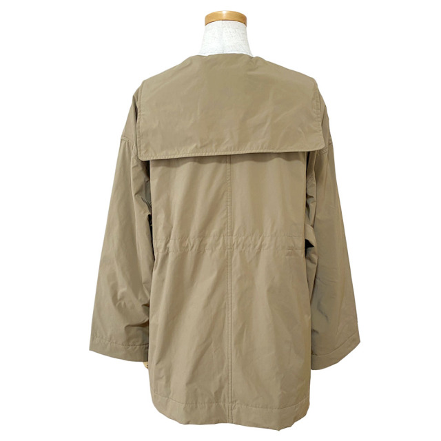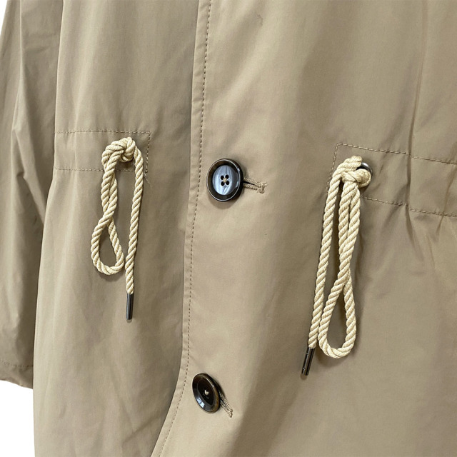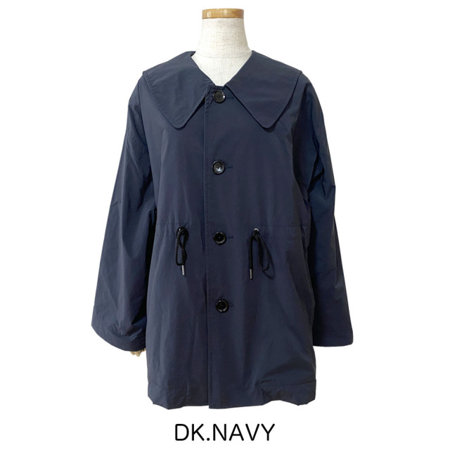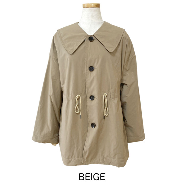 コマサーモという機能シートを入れた3層構造のアウター。 薄手・軽量ながらも保温性に優れています。 大きなセーラーカラーが特徴的。 肩が大きくドロップしたビッグサイズのアウターながら、ウエストをコードで絞ることで、シルエットにメリハリをつけることができます。 袖口は折り返しても着用可能です。 細番手のマイクロファイバーを使用した高密度ツイル。 微起毛によるマットな光沢が上品な印象を与えます。 割繊特有のシワ感とピーチタッチが特徴の素材です。