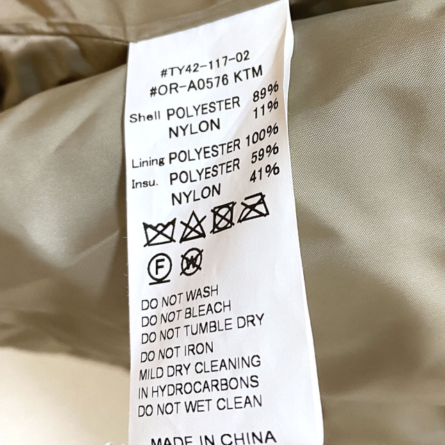 素材: 表地:ポリエステル89%ナイロン11% 裏地:ポリエステル100% 詰物:ポリエステル59%ナイロン41%