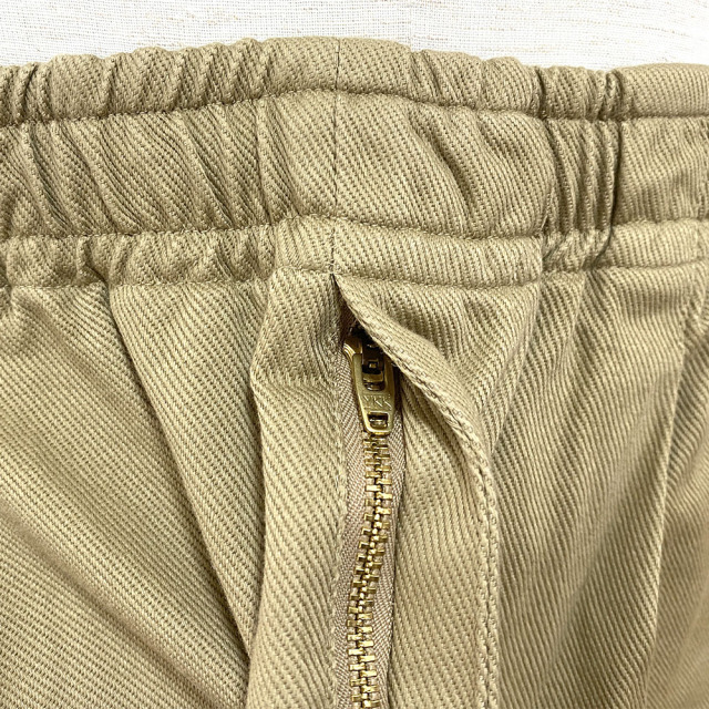 太めにとったゴムベルト部分と、裾に向かって広がるシルエットが特徴です。製品洗いで加工感を出しています。