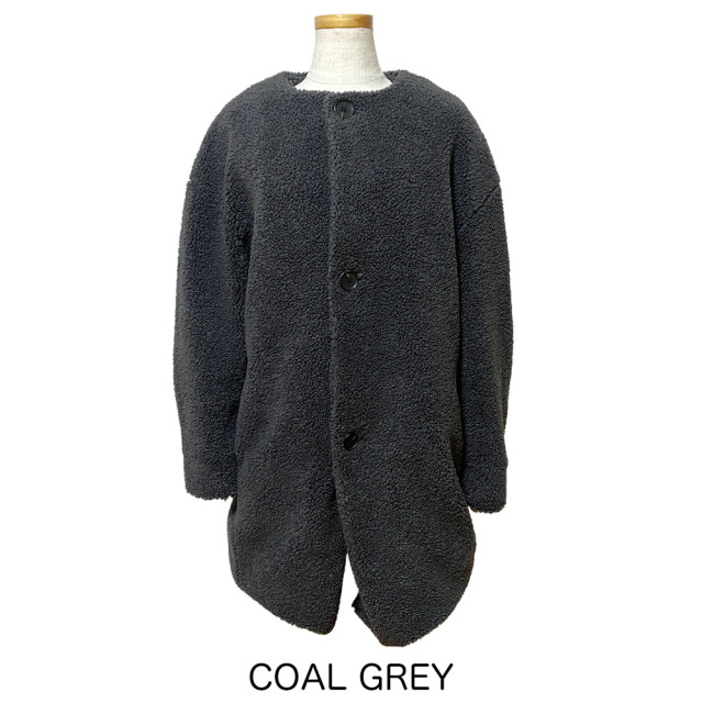 ノーカラーのボアコート、コクーンシルエットにすることでボリュームのあるボアでも綺麗に着用できるようにデザインしています。