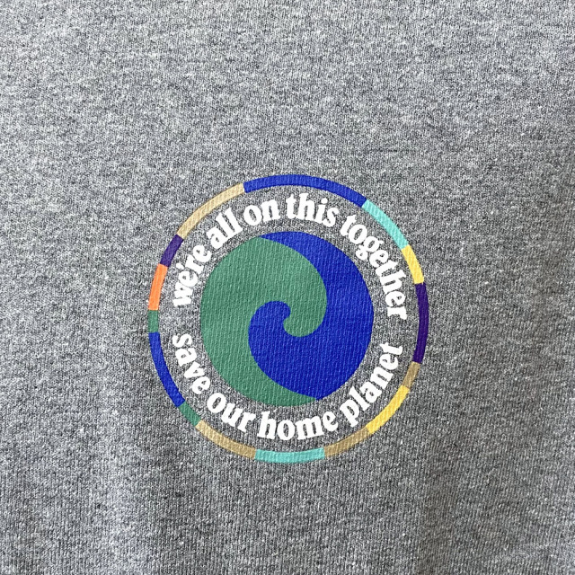 様式化された地球と「私たち全員が当事者である」というメッセージに加え、パタゴニアが目的とする「故郷である地球を救う」という文言がプリントされたユニティ・フィッツのTシャツ。100%リサイクル素材を使用してバージン原料への依存を削減。フェアトレード・サーティファイドの工場で製造
