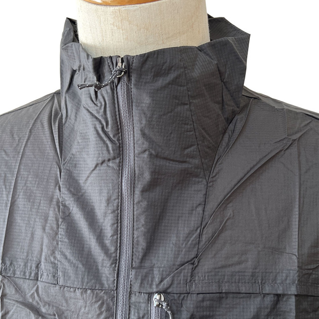 超軽量なリサイクル・ナイロン100%のシェル。 シェルには超軽量リサイクル・ナイロン100%素材のリップストップを使用し、軽度の水分を弾く有機フッ素化合物不使用のDWR(耐久性撥水)加工済み。 携帯電話や他の小物を収納できる大きさのテープ留め付きサイドポケットが2つ。左胸のジッパー式ポケットは貴重品を収納でき、ジャケット本体を収納可能。 左胸と右胸、そして背中中央にスリットを入れてベンチレーションを促進。 あごに快適なジッパーガレージ付き。 工場の従業員にプレミアム賃金が支払われるフェアトレード・サーティファイドの工場で製造