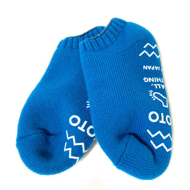 スリッパに替わる新しい履き物として考案した“ソックスリッパ”。ゆったりとした編み地で着脱のしやすいショート丈に仕上げることで、オーバーソックスとしての着用も可能に。また、保温性とやさしい肌あたりが魅力のアクリルとウールの混紡糸を、パイル状に編み込むことで絨毯のようなふかふかな感触に。足底のプリントはデザインとしてだけでなく、滑り止めとしての機能も果たします。