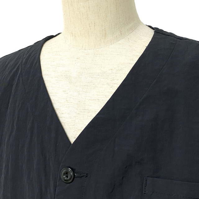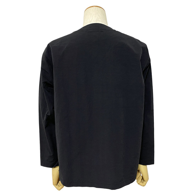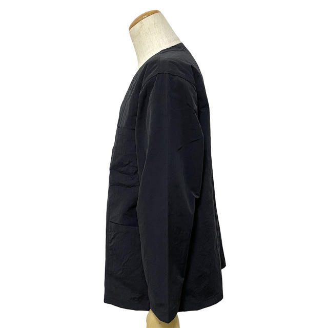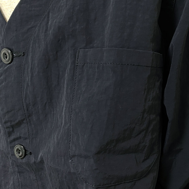 独特な表面感と風合いが特徴のナイロン素材に特殊加工を施しています。 自然なシワとしっかりとした風合いから、天然素材を思わせる他にはない雰囲気と軽さを持ち合わせた素材です。 今の気分でもある首元をスッキリ見せてくれるノーカラーに、羽織りやすいオーバーサイズシルエット。春だけではなくシーズンレスで着こなせるJacketです。