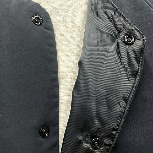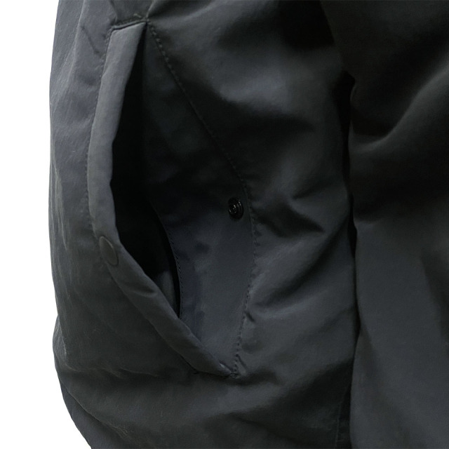 2022FWより人気の継続モデル。 特殊な加工によりマットでナチュラル、天然素材を思わせる独特な雰囲気と軽さを持ち合わせた素材。 シンプルなディテールデザインながら、程良い厚さの中綿がライニングされ、 アウターにもインナーにもなる抜群の対応力が備わったブルゾン。 トラベルコートとの重ね着もオススメです。