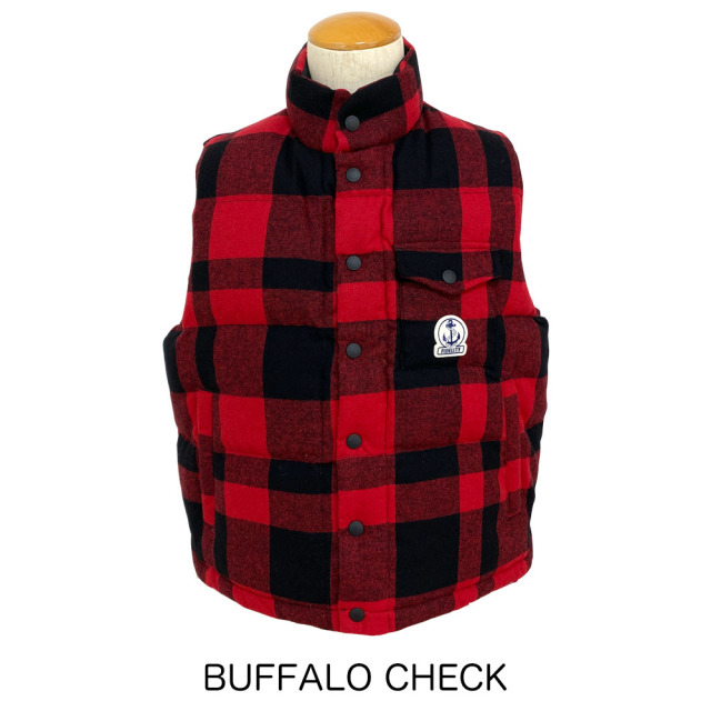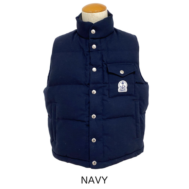 表と裏で素材を変え、違った表情が楽しめるリバーシブル仕様のダウンベスト。程よいゆとりのあるシルエットでユニセックスにも合わせやすいサイズ感。スナップボタンはFIDELITYの刻印入り。表の胸ポケットにFIDELITYのトレードマーク、錨モチーフのワッペンがポイント。 錨マークのロゴと、星条旗モチーフの2種のピンバッチが付き、気分に合わせてアレンジが可能。 表地はエターミンという薄手のウール素材で上品なイメージ、裏は黒のナイロンタフタでアーバンアウトドアな雰囲気に。 中綿はダウンと、太陽光や人体から発せられる赤外線に反応し、光エネルギーを熱エネルギーに変換して発熱させる機能綿のミックス使いでハイスペック。