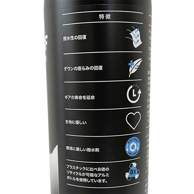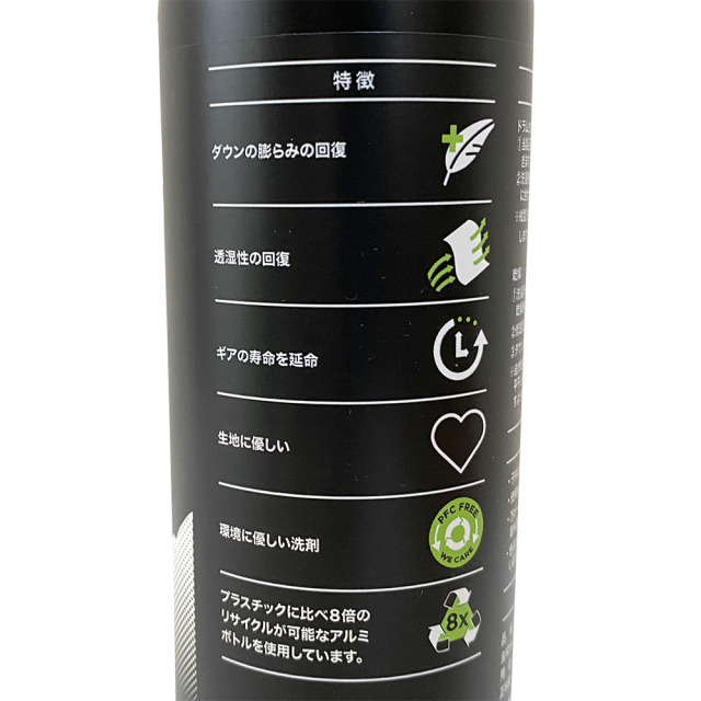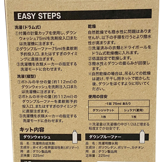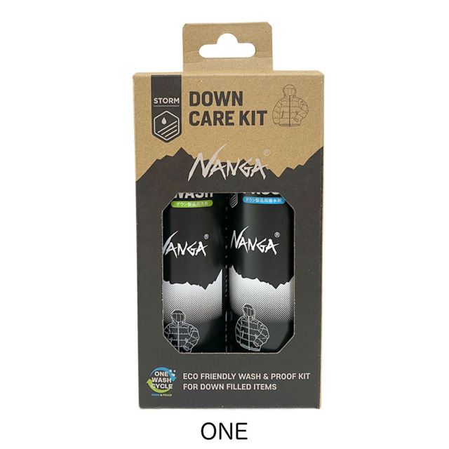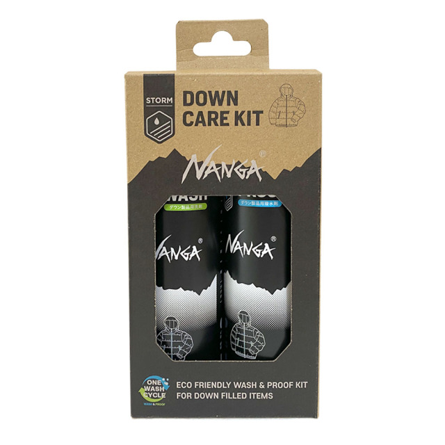 アウトドアウェア用洗剤と撥水剤のセット。 ダウン製品全般の洗濯、クリーニングに使える洗剤と撥水剤が、NANGA特注パッケージに。撥水剤と一度に入れて洗濯できるの大きな特徴。汚れを落としながら、ウェア本来の機能を回復させ、長持ちさせます。 汗や皮脂、ホコリなどでダウンや生地が汚れてしまうと、ダウンがスムーズに呼吸することができなくなり、ロフト低下=保温性の低下を招きます。ダウンの保温性を高め、維持するには、定期的な洗濯が不可欠。 また、環境汚染の原因となるPFC(過フッ素化合物類)を使用しない地球に優しい洗剤。