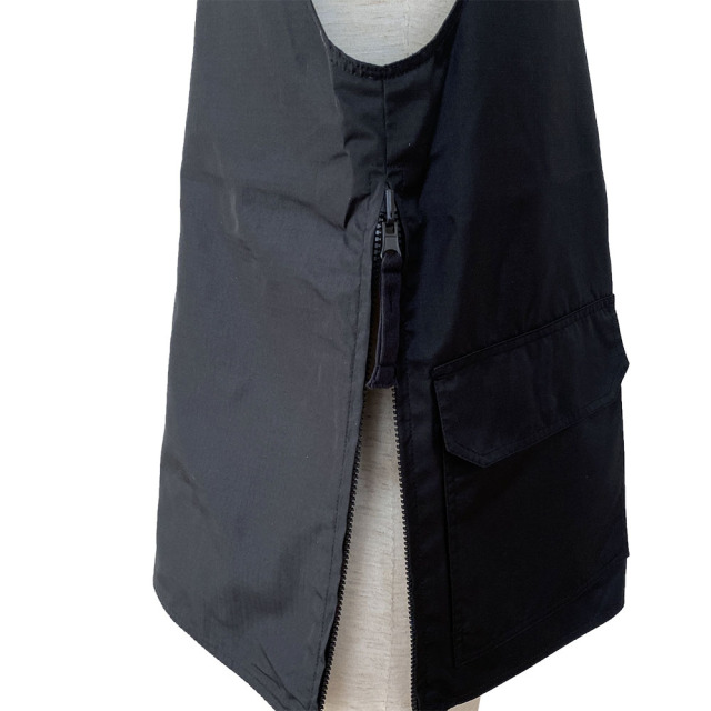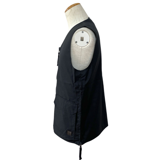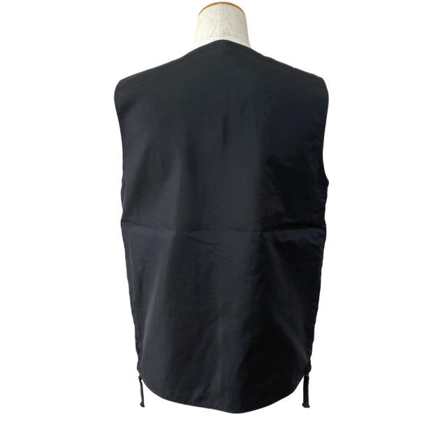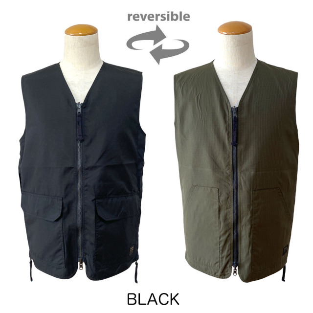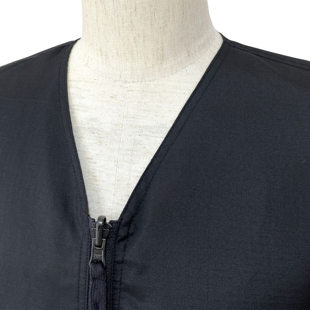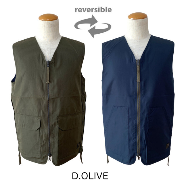 ダウン用のミリタリーライン生地を使用することで軽量で防汚性も担保した、ミリタリーリバーシブルVネックベストです。(ダウンは入りません) 前たてVネックはシャツ・カットソーなどとの重ね着がしやすく、Wジップはスリットの役割を果たしてくれます。 両脇スリットファスナーは、可動域が増えることで動きやすくなり、ボトムのポケットに手も入れやすく、重ね着を楽しんでいただける仕様となっています。 同生地のキャップ、バッグ、パンツなどと重ね着していただくこともお勧めします。