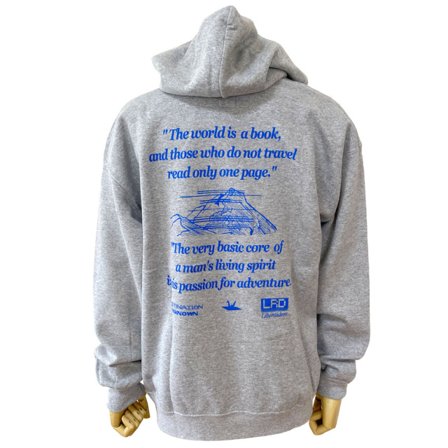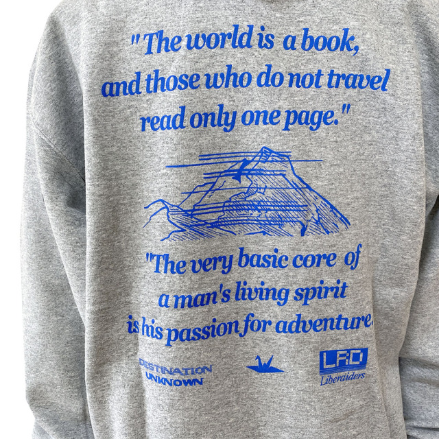 ヴィンテージ感のあるフロスト加工が特徴の8.0oz裏起毛を使用したプルオーバーフーディ。 胸には折鶴アイコンとロゴのプリント、バックには「世界は一冊の本だ、旅をしない人は本を一ページしか読んでいないのと同じだ。」「人間が生きていく精神の根底にあるのは、冒険への情熱です」と二つのメッセージと共に、その過酷さ故、今までに幾多の冒険家が挑戦するもその道を阻まれ、とうとう前人未踏の山として、登る事さえも禁止された、 『MEILI SNOW MOUNTAIN』が描かれています。 左袖口に入るLRロゴの刺繍がアクセントになっております。