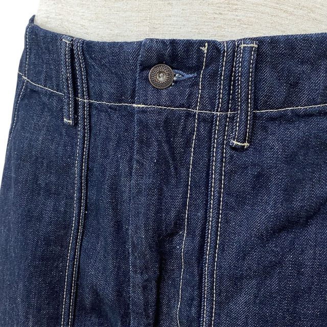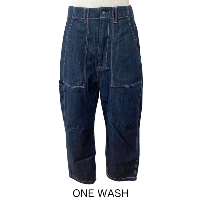 11.5ozのデニムを使用したサルエルベイカーパンツ。 Liberaidersのサルエルパンツのシルエットをベイカーパンツにリサイズし、バックのサブポケットはペインターパンツの仕様を取り入れ、ワークな雰囲気に。 ポケット周り、ベルトループにはロープを入れて補強。 ライトオンスなため軽く、通年で着用できる快適性があります。