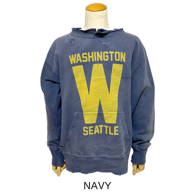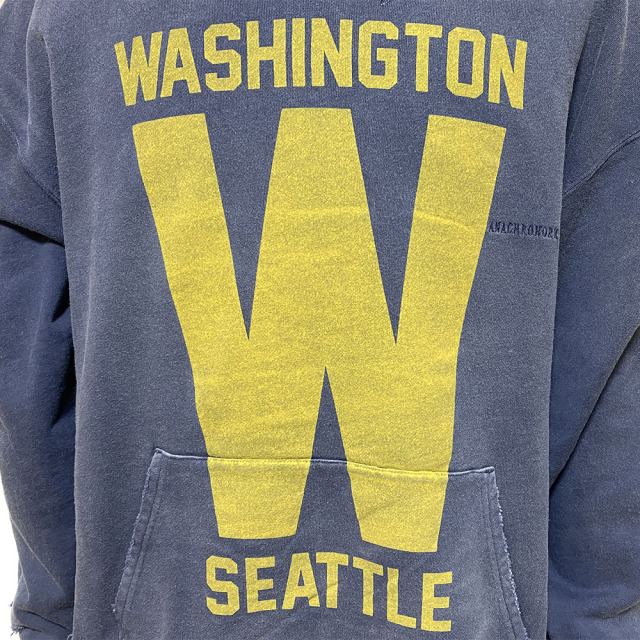 2種類の加工方法により、それぞれ奥行きのあるリアルな表情となっております。"W"のプリントデザインを手掛けるのは、ステンシルアーティスト守矢努氏。硫化染めを施した後、ブリーチを吹き付ける事で日焼けした様なエイジング感のある表情が特徴。そこから更に汚し加工を加えております。