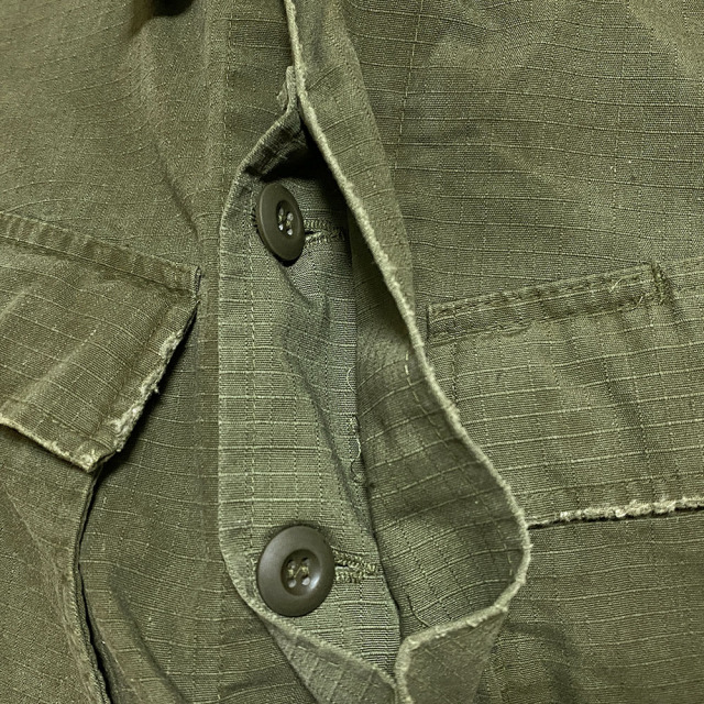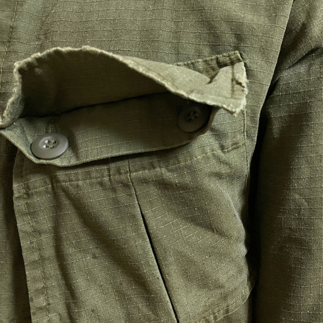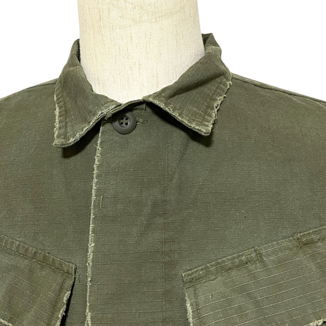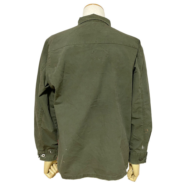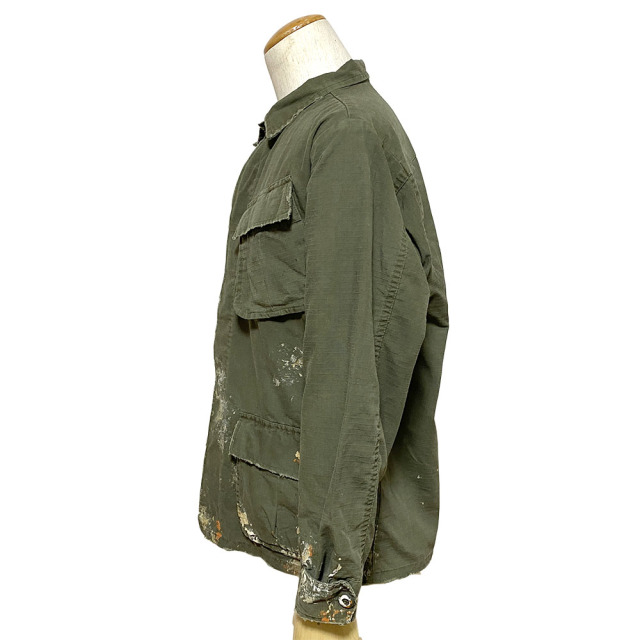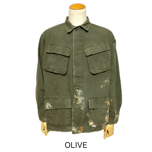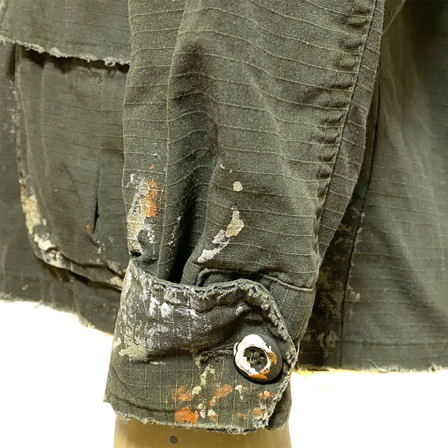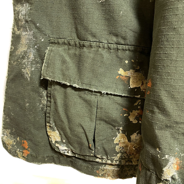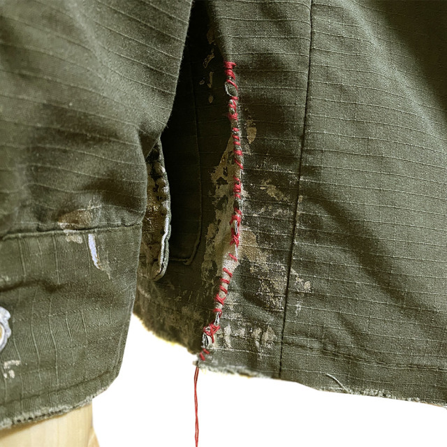 60's 後期型(4thモデル)のファティーグジャケットをリプロダクション。 白とオレンジでDIRT PAINTを施し、更に汚しを重ねる事で奥行きのある表情となっています。白とオレンジでDIRT PAINTを施した後にエイジングの加工。そして更に汚しを重ね、奥行きある表情を出しています。 赤ステッチの手縫いリメイクがポイント。コットン100%の高密度リップストップを採用。 強度が高く、破れやほつれに対する耐久性のある素材です。