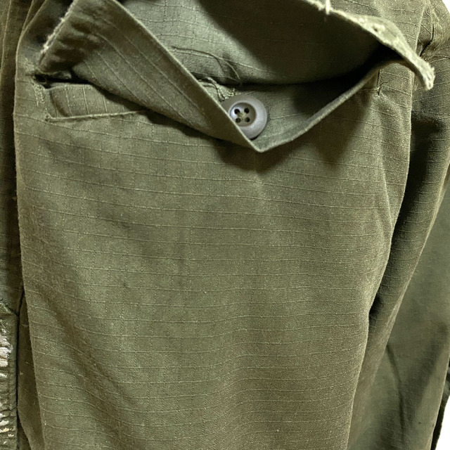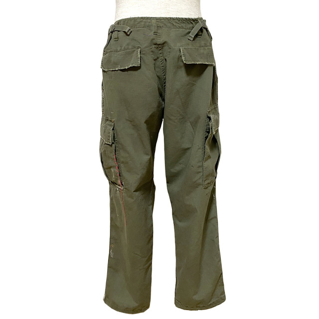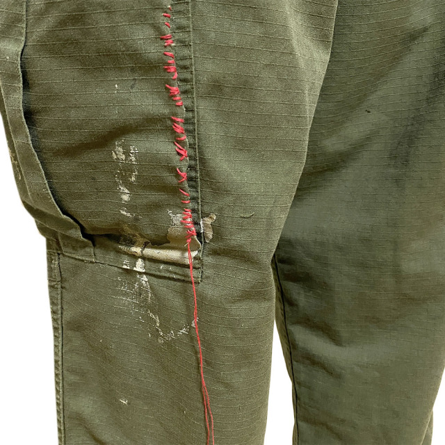 60's 後期型(4thモデル)のファティーグパンツをリプロダクション。白とオレンジでDIRT PAINTを施し、更に汚しを重ねる事で奥行きのある表情となっています。 白とオレンジでDIRT PAINTを施した後、エイジング加工。 そして更に汚しを重ねる事で奥行きある表情を出しています。 赤ステッチの手縫いリメイクがポイント。 コットン100%の高密度リップストップを採用。 強度が高く、破れやほつれに対する耐久性のある素材です。