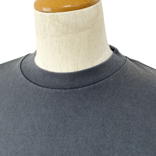 サイロ撚り(糸になる前の2本の粗いとを撚り合わせる事)した経糸と緯糸を交互に織った平編み生地。適度な厚みとハリが感じられ、光の加減によってやや光沢も感じられるクルーネックTシャツを製品染めでピグメント加工する事でビンテージ感を演出。